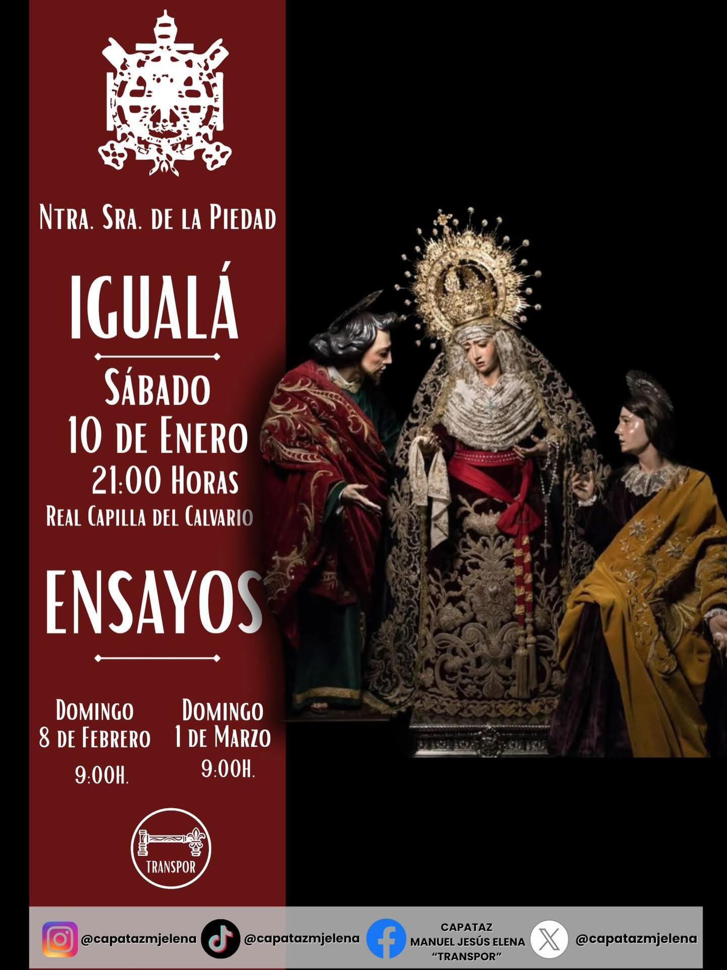 El capataz, D. Manuel Jesús Elena, convoca la igualá de costaleros para el paso de Nuestra Señora de la Piedad de cara...